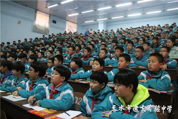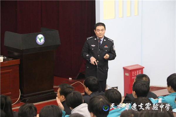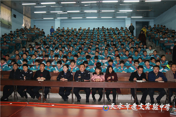 当天下午3时许,石马坪派出所及石马坪街道办事处相关人员来到学校,通过在校园内展出法治展板、发放法律知识资料、现场答疑解惑等形式,向全校师生进行普法宣传。4时许,学校请来天水市公安局法制支队执法监督大队长张建卓,专门向七年级同学做《法治教育暨交通安全知识》的法律讲座,就青少年违法犯罪、校园安全、交通安全,以及青少年如何知法、懂法、用法方面的法律知识进行讲解和释疑。张建卓队长的讲座引经据典,深入浅出,十分精彩,整个会场纪律良好,同学们一边认真聆听,一边记着笔记,不时爆发出雷鸣般的掌声。